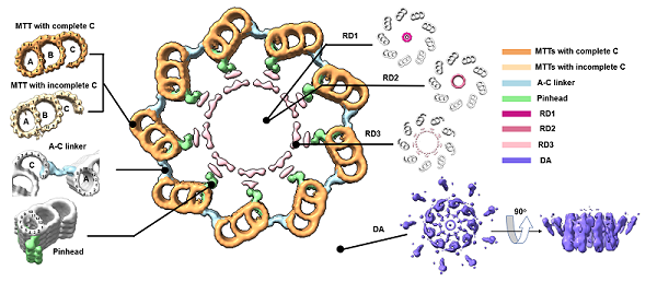 圖2. 人體中心粒的原位結構。中央大圖展示cryo-ET技術解析獲得的人中心粒橫截面圖。MTTs,微管三聯體;RD1-3,中心粒內部環狀密度;DA,遠端附屬結構。A-C linker,A管C管連接區。Pinhead,針頭狀結構。