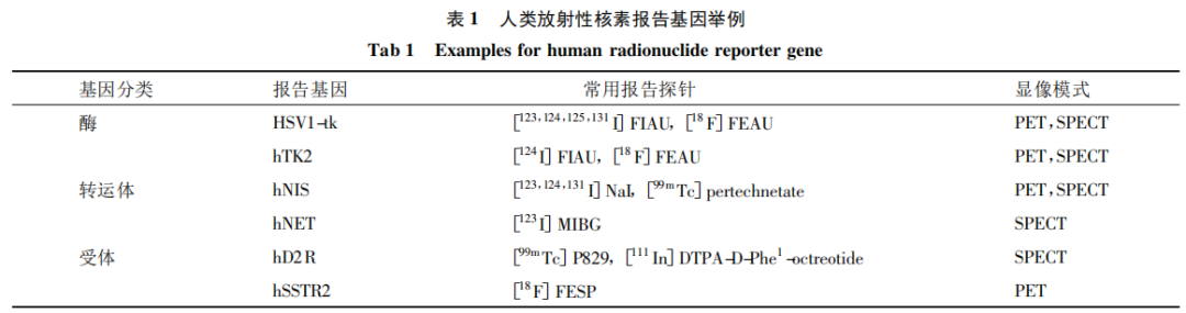 目前常用的報告基因有多種,可按編碼產物不同分類。以酶為基礎的報告基因包括單純皰疹病毒Ⅰ型胸苷激酶(herpes simplex virus-Ⅰthyminekinase,HSV1-tk) 報告基因及人線粒體胸苷激酶2( human thymidine kinase-2,hTK2) 報告基因等;以轉運體為 基礎的報告基因包括人鈉碘同向轉運體(human sodium-iodide symporter,hNIS) 報告基因、人去甲腎上腺素轉運體 (human norepinephrine transporter,hNET)報告基因等;以受體為基礎的報告基因包括人 多巴胺D2受體( human dopamine D2receptor,hD2R) 報告基因和人生長抑素2型受體(human somatostatinreceptor-2,hSSTR2) 報告基因等[8,9](表 1) 。