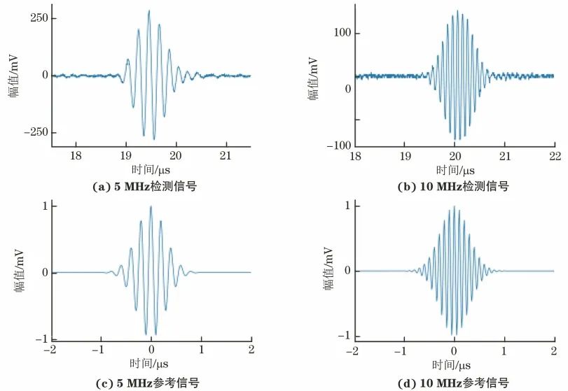 以0%壽命階段的某一試件為例,5 MHz和10 MHz檢測信號中的典型回波與選用的參考信號波形如圖4所示。由圖4可看出,參考信號與檢測信號的相似度較高,可獲得較好的濾波效果。