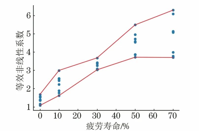 按照前述算法,根據各階段試件檢測信號計算βe,可得到βe與各疲勞階段的相關關系,如圖5所示。由圖5可以看出,βe隨著疲勞次數的增加而逐漸增大,不同疲勞階段的βe具有一定的區分度。