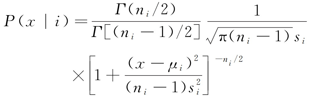 一般而言,隨機變量應服從正態分布,但在樣本量較小的情形下,可改用t分布描述隨機變量的分布情況。疲勞階段i的樣本數量為ni,則P(x|i)可表示成自由度為ni-1的t分布概率密度函數,即: