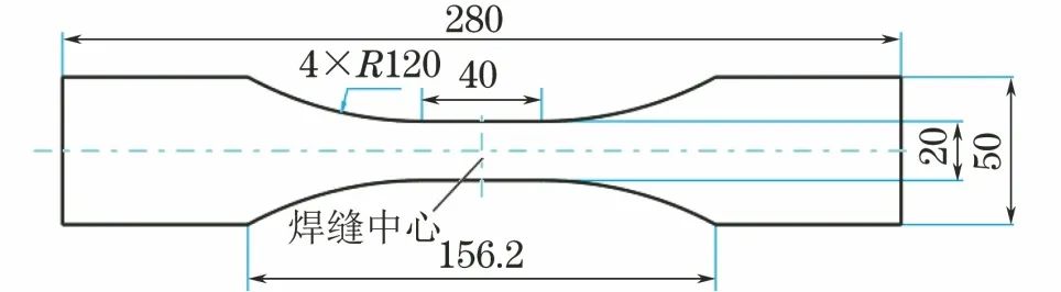 選取厚度為8 mm,材料為6005A-T6的鋁合金擠壓板材進行了單軸肩FSW對焊,焊后將焊接接頭磨平,按照圖1所示尺寸進行取樣加工,制備得到FSW焊接試件。