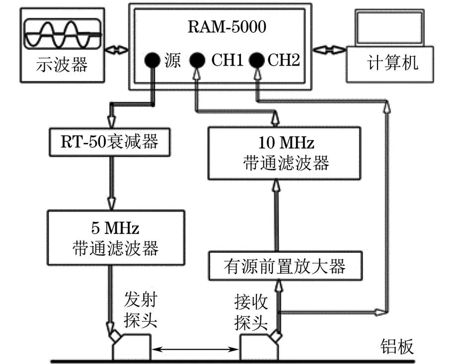 系統工作時,激勵信號經5 MHz帶通濾波器處理后,由發射探頭傳播進入試件中;采用寬帶探頭接收信號,其中基波信號直接傳入信號接收器,同時通過10 MHz帶通濾波器提取二次諧波信號并傳入另一路信號接收器。
