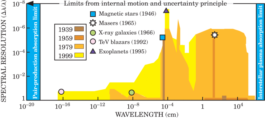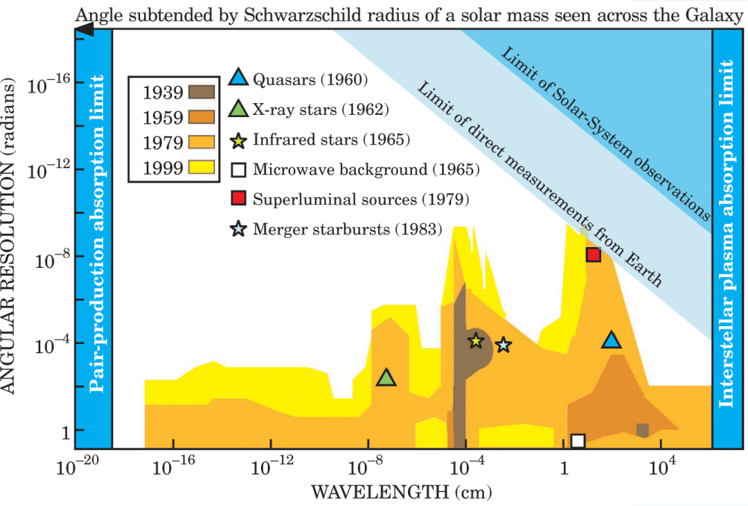 圖 1:20世紀天文儀器角度分辨率(相隔20年)的增長與相應波長的關系圖。圖中標記的關鍵發現向我們表明,每當必需的儀器出現后,新的現象能很快地被人們發現。波長軸的兩端分別對應星際電離氣體的吸收和宇宙微波背景光子導致的正負電子對的產生。斜的邊界標志著地球和太陽系尺寸給出的干涉基線限制。弧度的角分辨率可以分辨出在銀河系遠端的一個3千米大小(太陽的施瓦西半徑)的物體。