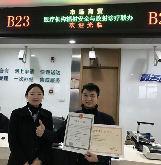 中國核技術網訊:近日,在杭州錢塘新區辦事服務中心大江東分中心B23號窗口,工作人員將辦結好的《放射診療許可證》和《輻射安全許可證》一并交到杭州蕭山新圍醫院經辦人手中,至此,錢塘新區完成首例醫療機構放射診療許可證和輻射安全許可證“一次申請,兩證同發”聯辦工作(以下簡稱“兩證聯辦”)。
