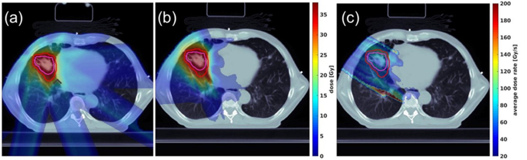 圖3.透射式和布拉格峰式肺癌的FLASH質子計劃二維劑量分布比較。(a)典型的FLASH質子PBS透射式計劃;(b)典型的單能質子PBS布拉格峰式FLASH肺癌計劃,計劃中的劑量處方為每分次18 Gy;(c)一個單能質子布拉格峰式計劃射野的平均劑量率分布,結果顯示大于40 Gy/s的平均劑量率分布能夠在大部分正常組織中實現
