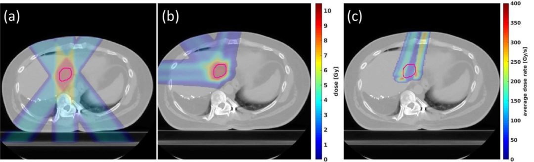 圖4.透射式和布拉格峰式肝癌的FLASH質子計劃二維劑量分布比較。(a)典型的FLASH質子PBS透射式計劃;(b)典型的單能質子PBS布拉格峰式FLASH肝癌計劃,計劃中的劑量處方為每分次10 Gy;(c)一個單能質子布拉格峰式計劃射野的平均劑量率分布,結果顯示大于40 Gy/s的平均劑量率分布能夠在大部分正常組織中實現