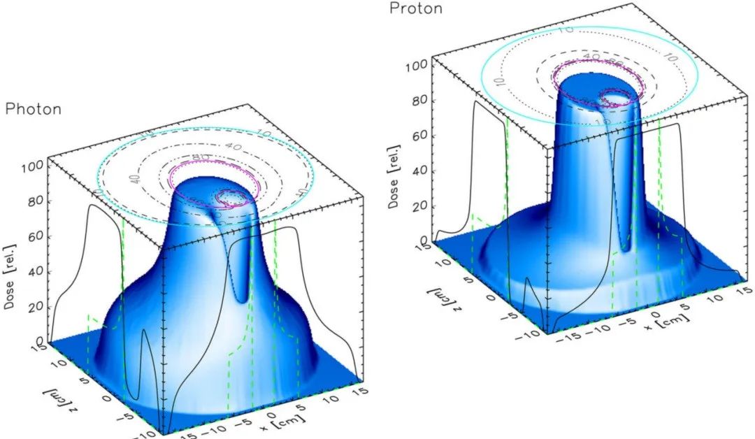 圖1.光子和質子束對于包裹在危及器官周圍的腫瘤靶體積的劑量適形潛力的理論極限。在這兩種情況下均采用了弧形治療和調強。質子劑量分布未考慮射程不確定性。