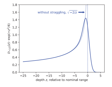 根據Bethe Bloch方程,質子在正常組織中的阻止本領與質子速度的平方近似成反比,與其動能大致成反比:圖2.布拉格峰曲線(實線)的函數形式圖,以冪函數的卷積形式描述深度Z處的阻止本領,具有高斯射程離散分布。虛線展示不含射程歧離的情況。