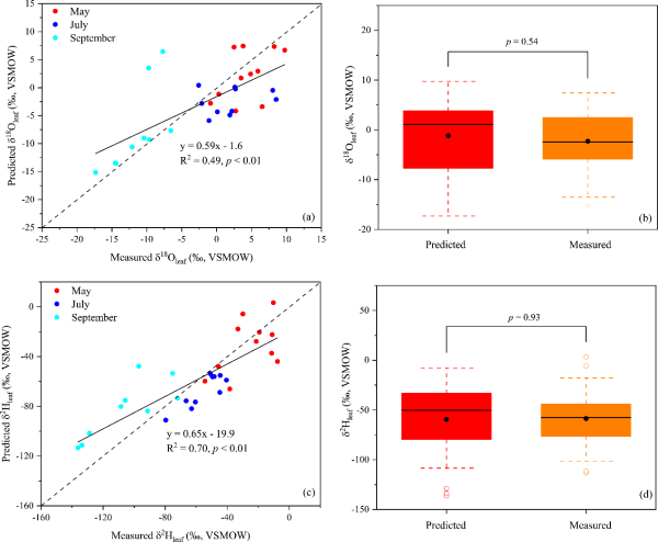 圖2.葉片水氫和氧同位素比值測定值和C-G模型預(yù)測值對比