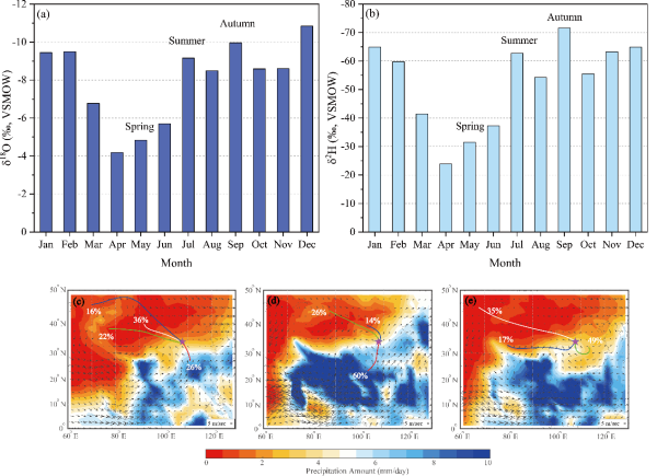 圖3.年平均降雨氫和氧同位素比值變化和不同月份HYSPLIT降雨路徑模擬