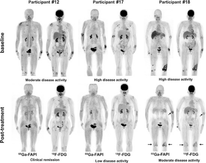 此外,三名參與者在治療6至10個月后接受了Ga-68 FAPI和F-18 FDG PET/CT隨訪,其中兩名參與者疾病反應良好和緩解,顯示其關節內放射性示蹤劑的攝取減少。