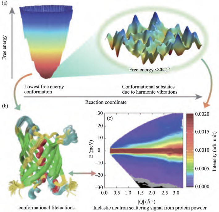 蛋白質(zhì)是生物體的重要組成部分,具有非常多的功能,不同的結(jié)構(gòu)決定了其不同的功能。但是只關(guān)注蛋白質(zhì)的靜態(tài)結(jié)構(gòu)還是不夠的,生命體絕大多數(shù)的功能過程都是通過蛋白質(zhì)特定的三維運動來實現(xiàn)的。非彈性中子散射技術(shù)是研究蛋白質(zhì)動力學(xué)信息的一種重要手段。相較于X光,中子對蛋白質(zhì)中的輕元素如氫、碳等更加敏感,而且對蛋白質(zhì)的輻照損傷也更小,更加適合做長時間的測量,缺點是需要樣品的量要大得多,且需要氘代。