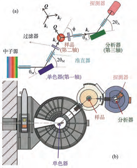 用于進行非彈性中子散射實驗的儀器一般被稱為中子散射譜儀,常見的類型包括三軸譜儀和飛行時間譜儀。三軸譜儀,顧名思義,有三個可以獨立繞軸旋轉(zhuǎn)的部分,分別是單色器、樣品臺和分析器,圖2 展示了三軸譜儀的基本構(gòu)造。單色器是一塊單晶,通過布拉格衍射來選擇特定波矢和能量的入射中子。樣品臺也可以轉(zhuǎn)動來改變樣品的方向。分析儀與單色器類似,也是一塊單晶,通過改變和樣品臺的角度來區(qū)分具有特定波矢和能量的出射中子。這樣,研究人員就可以根據(jù)得到的入射和出射中子的數(shù)據(jù)來得到散射過程中發(fā)生的動量和能量轉(zhuǎn)移行為,進而來分析樣品微觀結(jié)構(gòu)的動力學(xué)行為。三軸譜儀一般利用的是核反應(yīng)堆提供的高通量中子。