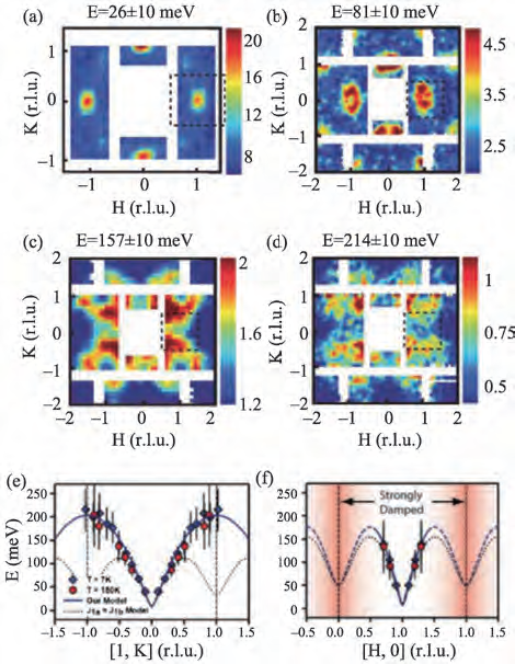 圖4 鐵基超導(dǎo)體母體非彈性中子散射測量信號。(a)—(d)倒空間里不同能量的激發(fā);(e),(f)激發(fā)信號在能量空間的色散關(guān)系