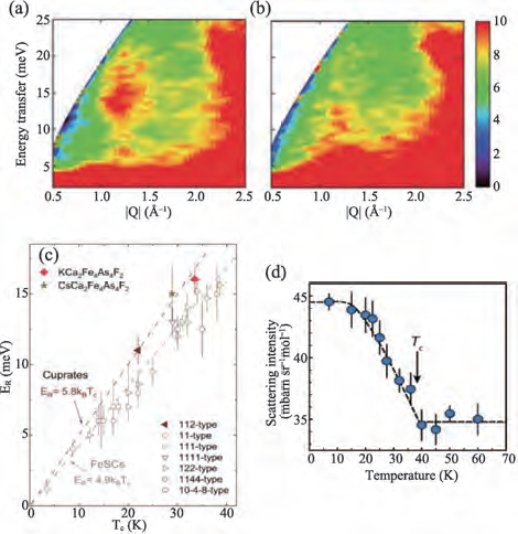 圖5 高溫超導(dǎo)體中的自旋共振態(tài)。(a),(b)鐵基超導(dǎo)體Ba0.6K0.4Fe2As2中自旋共振態(tài)出現(xiàn)在超導(dǎo)溫度之下,在正常態(tài)消失;(c)自旋共振態(tài)的能量和超導(dǎo)轉(zhuǎn)變溫度成線性關(guān)系;(d) Ba0.6K0.4Fe2As2 中自旋共振態(tài)的超導(dǎo)序參量行為