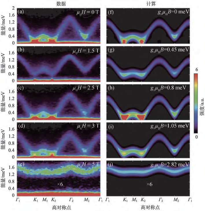 圖8 TmMgGaO4中的磁激發(fā)色散關(guān)系(a)—(e)沿著圖5(b)所示高對稱方向的中子散射強度隨外場的變化;(f)—(j)橫場伊辛模型的線性自旋波計算結(jié)果