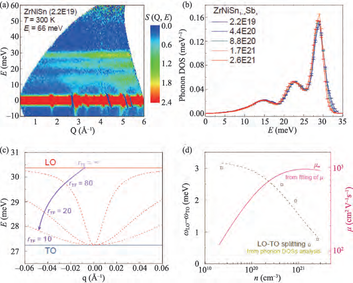 圖9 (a) ZrNiSn 半哈斯勒熱電材料的聲子激發(fā);(b) 通過非彈性中子散射實驗獲得的摻雜濃度不同的ZrNiSn1-xSbx樣品的聲子態(tài)密度;(c) LO-TO劈裂與屏蔽效應(yīng);(d) 極化光學(xué)聲子散射的屏蔽效應(yīng)