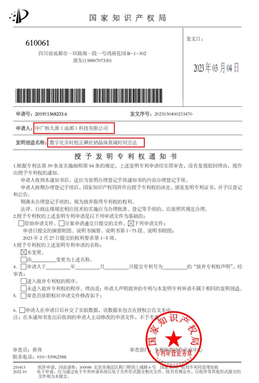 中廣核技受托管理中廣核久源(成都)科技有限公司自主發明專利《數字化實時校正碘化鈉晶體衰減時間方法》(專利號:ZL201911368233.6)依托于國家重點研究項目,旨在對晶體衰減時間進行數字化實時校正,大大降低由于晶體衰減時間變化引起的能譜測量設備譜線漂移現象,拓展了該類型探測器的應用場景。