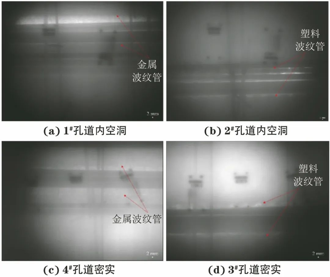 試驗梁的X射線數字成像檢測結果如圖3所示,1#孔道為金屬波紋管,2#孔道為塑料波紋管,3#孔道為塑料波紋管,4#孔道為金屬波紋管,每次透照均在平板探測器側布置像質計。