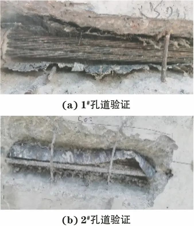 為驗證1#孔道和2#孔道對應的透照結果與實際情況是否符合,采用局部破損法,直接從試驗梁一側打開預應力索孔道,依據實際局部破損驗證結果,如圖4所示,可見數字X射線檢測結果與實際情況相符。
