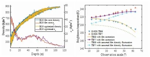 圖1:格陵蘭冰蓋積雪層密度波動特征估計及輻射亮溫修正結果