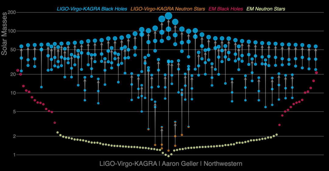 黑洞無法直接觀測,可以通過間接方式得知其存在與質量。研究表明,黑洞質量“禁區(qū)”的位置和寬度與被稱為核天體物理“圣杯”反應的12C(α,γ)16O的反應率有很強的依賴關系。較大的“圣杯”反應的天體物理反應率可以提高大質量恒星在核心氦燃燒結束之后16O的豐度,從而導致隨后的恒星燃燒過程有利于產生更多的正負電子對,使得黑洞質量“禁區(qū)”的上下限降低。近年來激光干涉引力波天文臺(LIGO)和室女座引力波天文臺(Virgo)的引力波探測提供了大量的恒星級黑洞質量數據(見上圖),使基于恒星演化模型對黑洞質量“禁區(qū)”進行計算和驗證成為可能。然而,“圣杯”反應的反應率誤差目前還達不到恒星演化模型要求的10%的精度,且部分關鍵反應參數還存在較大分歧。