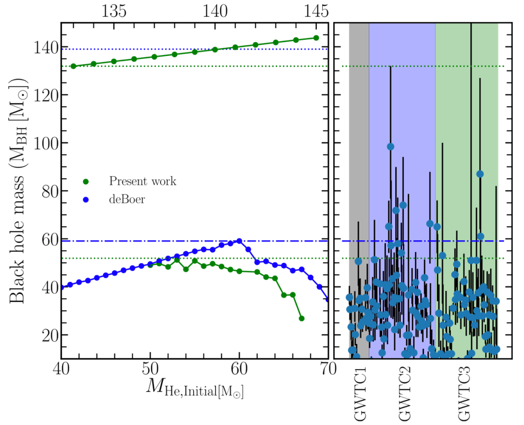 左圖為黑洞質量與形成黑洞前的恒星氦核心初始質量間的關系,右圖為LIGO-Virgo黑洞質量的數據