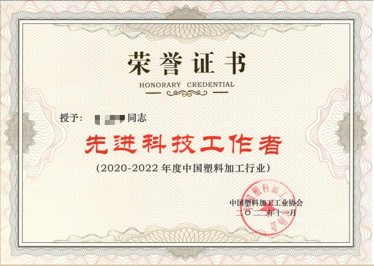 1名研發(fā)人員榮獲“2020-2022年度中國塑料加工行業(yè)先進(jìn)科技工作者”