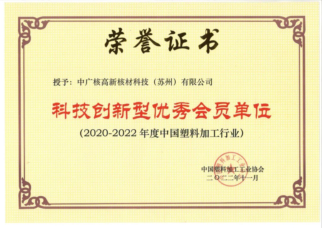 堅(jiān)持科技創(chuàng)新,深根于行業(yè)沃土。截止目前,中廣核(蘇州)科技公司已申請(qǐng)專利80余件,其中授權(quán)發(fā)明專利22件;參與國家標(biāo)準(zhǔn)編制5項(xiàng);成果通過江蘇省新產(chǎn)品、新技術(shù)鑒定19項(xiàng)。勇?lián)袠I(yè)重任,充分發(fā)揮企業(yè)示范引領(lǐng)和帶動(dòng)作用,“2020-2022年度中國塑料加工行業(yè)科技創(chuàng)新型優(yōu)秀會(huì)員單位”這一殊榮的獲得,是行業(yè)對(duì)中廣核(蘇州)科技公司研發(fā)和技術(shù)創(chuàng)新能力的充分肯定。