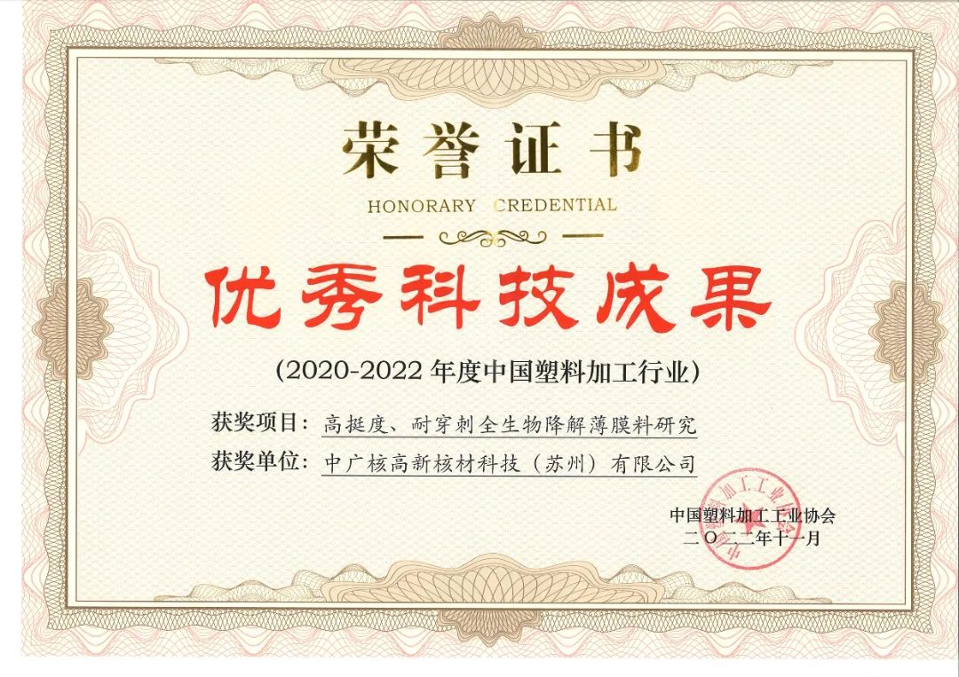 “高挺度、耐穿刺全生物降解薄膜料研究”項(xiàng)目研發(fā)出的產(chǎn)品具有優(yōu)異的挺度和耐穿刺性能、同時(shí)具有較好擠出、吹塑、熱封等工藝。產(chǎn)品通過權(quán)威檢測(cè)機(jī)構(gòu)德國萊茵TÜV公司的生物可降解相關(guān)檢測(cè),通過GB19277.1、歐盟EN 13432、美國BPI、澳大利亞ABA等生物降解國際主流標(biāo)準(zhǔn)測(cè)試,取得“Seedling及DIN-Geprüft工業(yè)堆肥證書”。食品接觸應(yīng)用通過食品可接觸測(cè)試標(biāo)準(zhǔn)。產(chǎn)品廣泛應(yīng)用于快遞、奶茶飲品等連鎖品牌產(chǎn)品。