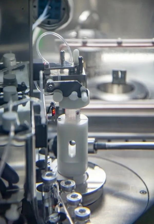 4點左右,開始進行合成工序,合成完畢的藥品由合成熱室傳輸至分裝熱室,利用自動分裝儀分裝至無菌西林瓶中;生產出的藥品會被取樣送質量部進行檢測,然后根據醫院訂單要求進行分裝。