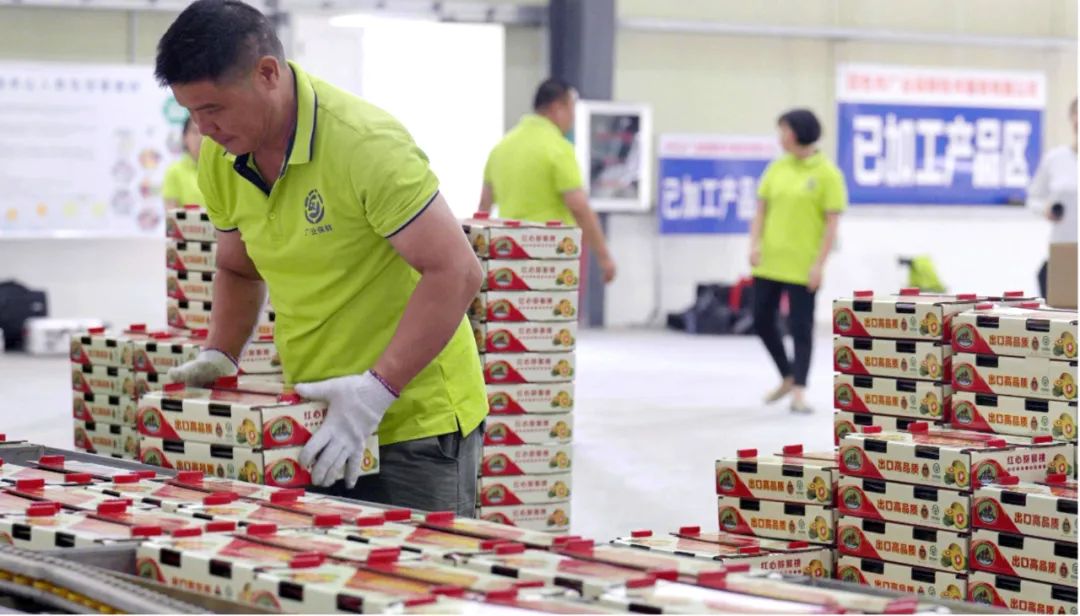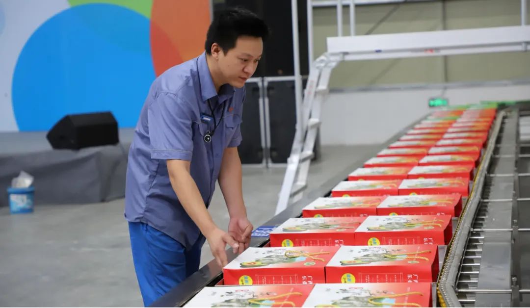 工人從電子束自動傳輸線取走加工完成的盒裝獼猴桃。