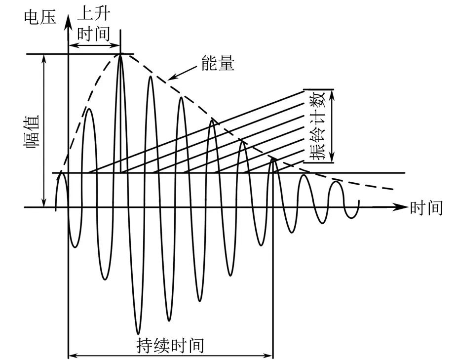 參數分析方法通過波形特征參數表征聲發射信號,再對其進行統計分析,實現對故障的診斷。聲發射主要的特征參數定義示意如圖2所示,其主要包括幅值、能量、有效電壓值以及振鈴計數等。參數分析法簡潔快速,是近幾十年來使用最廣泛的經典分析方法,但是容易丟失細節信息。