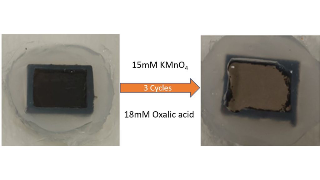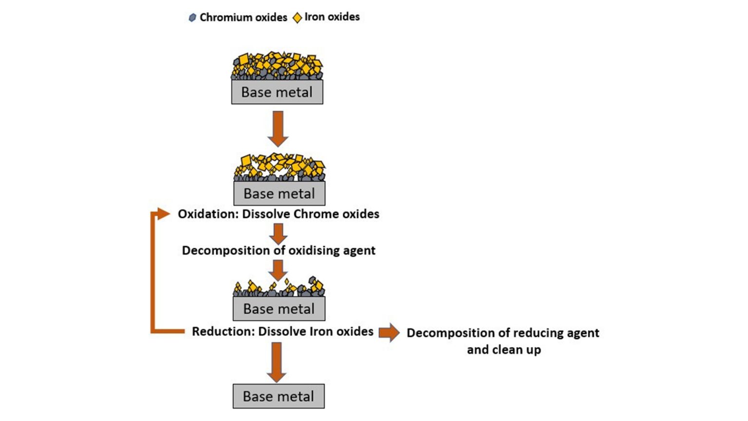 放射性廢金屬的去污方法有化學試劑去污、激光去污、電凝等幾種。8使用化學試劑的此類去污方法之一是化學氧化還原去污 (CORD) 過程,這是一種世界知名的兩步去污過程。9-11在第一步中,高錳酸根離子 (MnO 4 -) 用于氧化鉻氧化物層并釋放鉻酸根離子。9,12在下一步中,添加草酸以將高錳酸根離子還原為水性 Mn 2+離子,并從合金表面溶解富含 Fe 和 Ni 的氧化物層。9,12整個過程如圖 2 所示,每個步驟持續三到六個小時,并且可以重復多次。