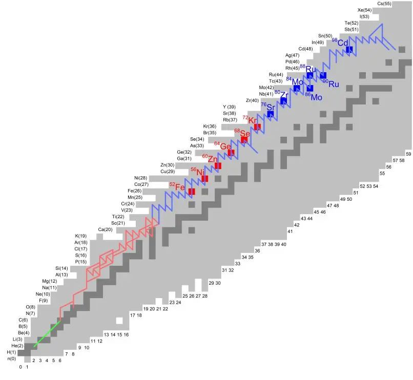 圖 I型X射線暴發生的熱核反應路徑包含3反應(綠線)、突破過程(紅線)和快質子俘獲過程(藍線) 。圖源| 參考文獻[3]