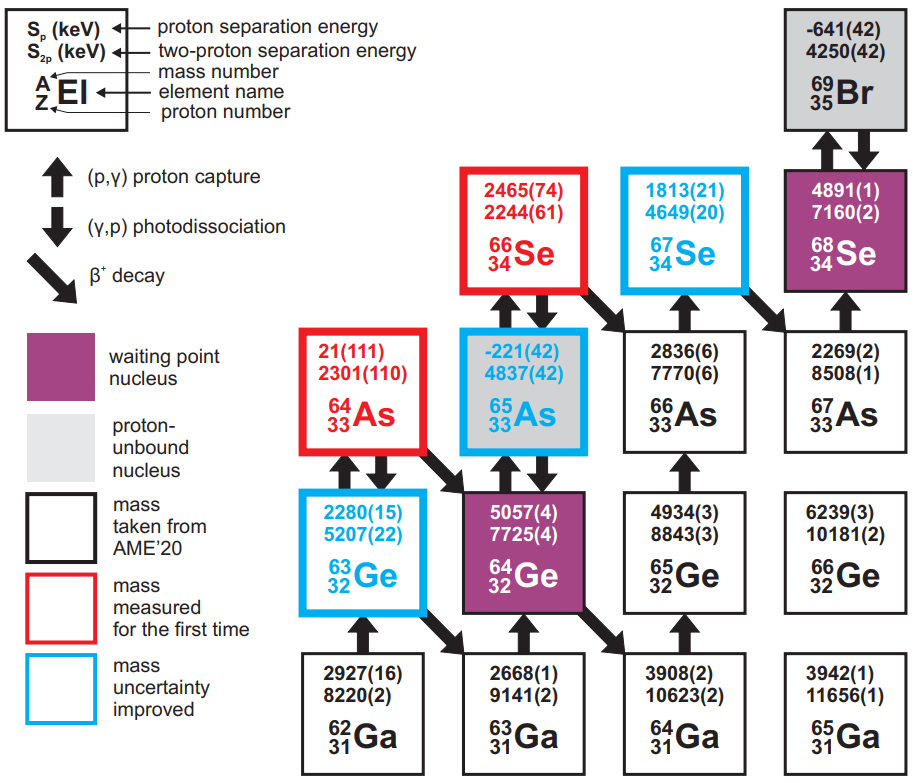 鍺-64就像是核過程路徑上的一個“十字路口”,是核反應進行到中等質量核區時遇到的一個重要的擁堵路段。鍺-64附近的原子核質量,尤其是砷-65、硒-66的質量,對核反應的走向和能量釋放具有重大的影響,并進一步決定了X射線暴灰燼中的元素豐度、光度曲線的形狀和持續時間等。
