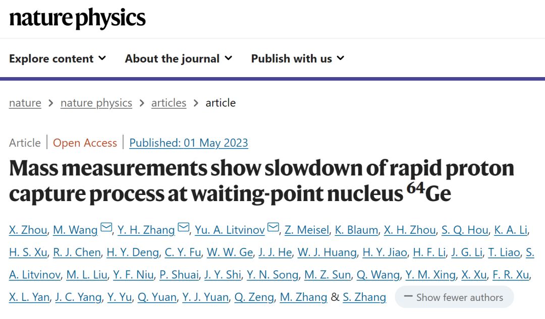 利用新型質譜術,近代物理所聯合多家單位精確測量了砷-64、砷-65、硒-66、硒-67、鍺-63等原子核的質量,從而在實驗上首次確定了與等待點核鍺-64相關的所有核反應能。其中,砷-64和硒-66的質量是國際上首次測量,其他原子核的質量精度均得到提高。