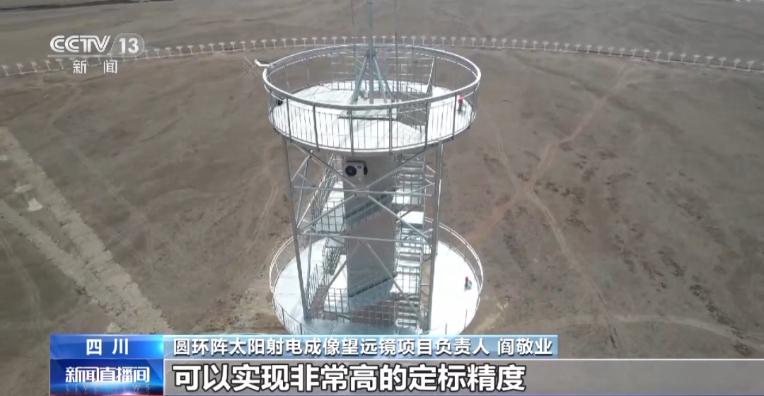 圓環陣太陽射電成像望遠鏡項目負責人 閻敬業:我們選擇了圓環形,這樣利用中心定標塔它到每一個天線的距離差不多相等,而且天線在看中心定標塔的時候互相沒有遮擋,可以實現非常高的定標精度。就像我們做光學望遠鏡,我們把鏡頭擦亮,我們拍照的效果就好,那么定標如果做得好、相位一致性如果高,這個射電望遠鏡也會像一個非常平滑的鏡頭一樣,實現一個高質量的成像。