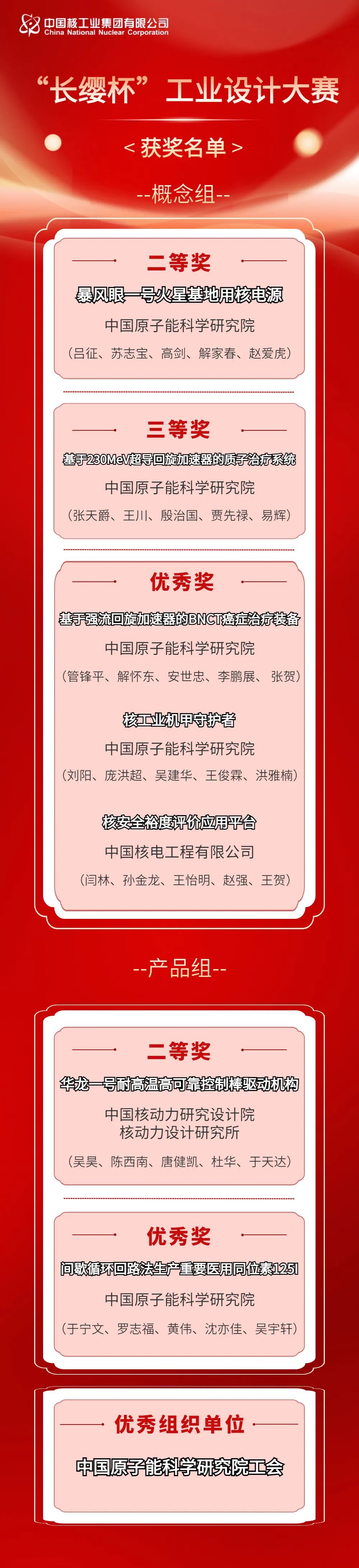 其中,中國原子能科學研究院共斬獲7項榮譽:在“長纓杯”工業設計大賽中,“暴風眼一號火星基地用核電源”、“基于230MeV超導回旋加速器的質子治療系統”項目團隊分別獲得“概念組”二、三等獎;“基于強流回旋加速器的BNCT癌癥治療裝備”、“核工業機甲守護者”項目團隊獲得“概念組”優秀獎;“間歇循環回路法生產重要醫用同位素125I”項目團隊獲得“產品組”優秀獎。“中國原子能科學研究院工會”分別獲得“長纓杯”工業設計大賽“產品組”和首屆工藝技術創新大賽“機械制造組”優秀組織單位稱號。