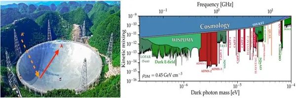 暗光子暗物質可以在地面上的射電望遠鏡的反射板或偶極天線上引起電子振蕩,從而在望遠鏡的探測器上產(chǎn)生單頻射電信號,其輻射頻率與暗光子質量根據(jù)質能方程轉換得到的特征頻率相同。利用我國500米口徑球面射電望遠鏡(中國天眼,F(xiàn)AST)的觀測數(shù)據(jù),黃曉淵與合作者在1-1.5GHz尋找暗光子暗物質產(chǎn)生的信號,給出了這個頻率范圍內(nèi)對暗光子暗物質的最強實驗限制。已有的低頻陣列射電望遠鏡(LOFAR)、在建的平方千米陣列射電望遠鏡(SKA)以及未來FAST望遠鏡將能夠達到更高的靈敏度,有發(fā)現(xiàn)此類暗物質的潛力。