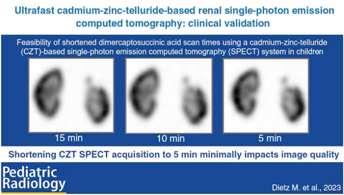法國里昂大學的Matthieu Dietz博士領導的一個小組使用基于碲化鎘鋅(CZT)的探測器的相機模擬了兒童縮短的锝-99m (Tc-99m) dimercaptosuccinic acid (DMSA) SPECT采集時間。他們發現,與標準平面成像相比,減少曝光時間對質量和再現性的影響很小。