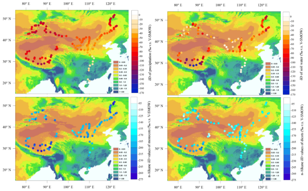 針對目前國際上應用葉蠟氫同位素定量重建古降水面臨氫同位素表觀分餾系數(shù)不穩(wěn)定這一難題,中國科學院地球環(huán)境研究所研究員劉衛(wèi)國團隊系統(tǒng)調(diào)查了我國不同區(qū)域(包括青藏高原、新疆、中國東北和中國南方)的陸生植物葉蠟δD組成和對應的源水(降水和土壤水)δD組成,以及控水實驗觀測的葉蠟δD組成和對應的源水(土壤水和葉片水)δD組成,討論了高等植物葉蠟氫同位素表觀分餾系數(shù)的變化特征和主要影響因素。