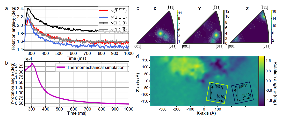 單晶高溫合金相比多晶材料具有更好的高溫強(qiáng)度、抗蠕變和抗疲勞性能,廣泛應(yīng)用于航空發(fā)動機(jī)及燃?xì)廨啓C(jī)渦輪葉片等。增材制造技術(shù)不僅可以對單晶葉片進(jìn)行修復(fù),在單晶葉片的制造領(lǐng)域也展現(xiàn)出巨大的應(yīng)用前景。金屬增材制造過程是典型的超快、動態(tài)、非可逆過程,HEPS結(jié)構(gòu)動力學(xué)線站建設(shè)團(tuán)隊(duì)基于BSRF開發(fā)了金屬增材制造原位表征平臺,利用時間分辨Laue衍射技術(shù),動態(tài)捕捉到鎳基單晶外延生長過程中的瞬態(tài)晶體轉(zhuǎn)向和雜晶生長過程,解決了傳統(tǒng)手段無法原位表征增材制造“中間過程、內(nèi)部結(jié)構(gòu)”的困難;并結(jié)合有限元模擬及分子動力學(xué)仿真,揭示了高斯光束不均勻加熱所帶來的局域變形、與晶體轉(zhuǎn)向及雜晶形核之間的內(nèi)在聯(lián)系,為航空發(fā)動機(jī)單晶葉片激光增材制造及修復(fù)過程中晶體取向控制提供了重要理論依據(jù)。