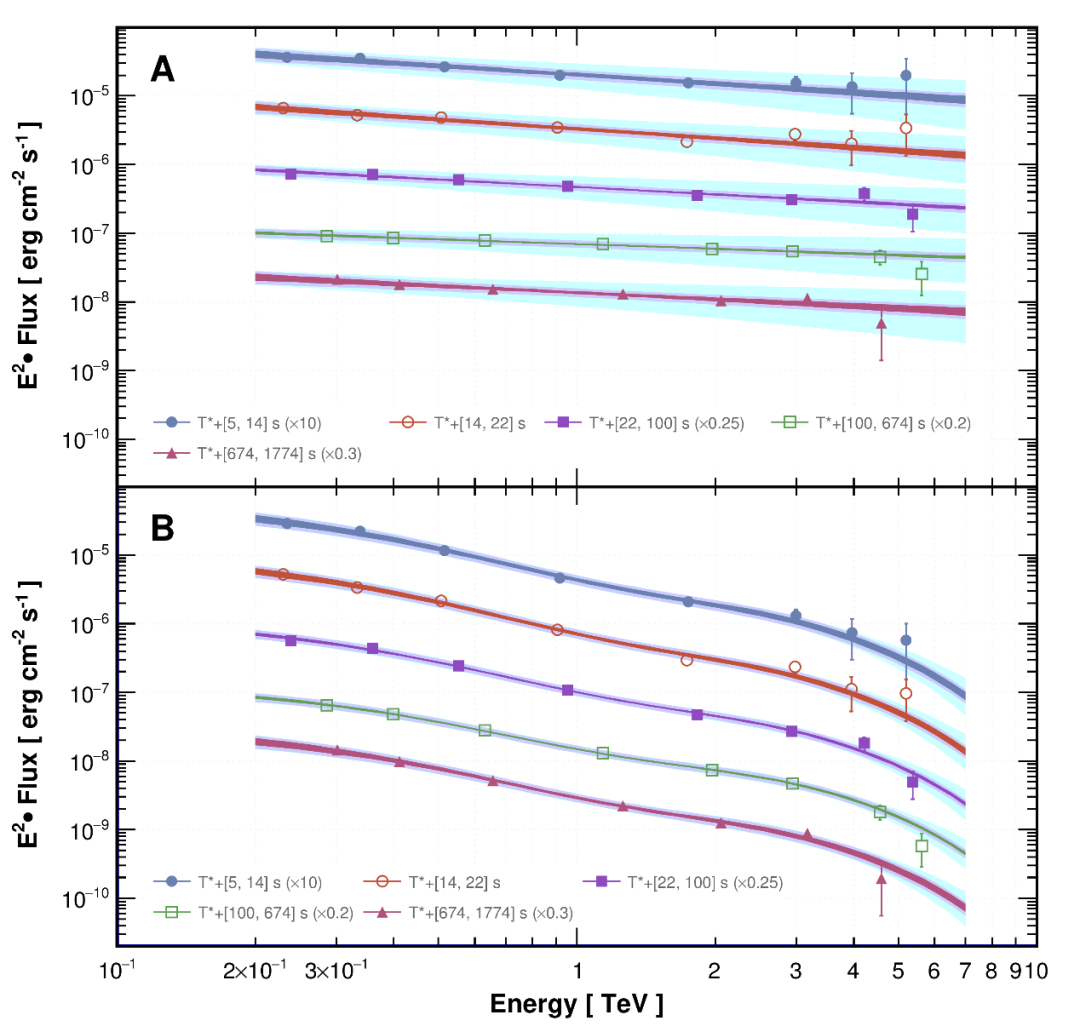圖2:“拉索”測量得到的伽馬射線暴221009A在5個時間段的本征譜與觀測譜,能量范圍約在2千億到7萬億電子伏特之間。