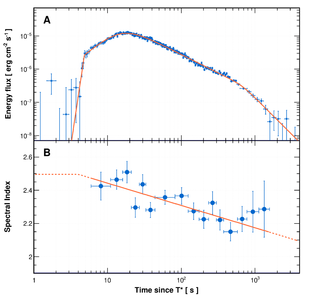 圖3:“拉索”觀測到的3千億到5萬億電子伏特能量范圍的GRB221009A余輝輻射的光變過程與能譜指數演化,以及函數擬合。“拉索”首次實現了伽馬射線暴千億電子伏特以上余輝輻射過程的完整觀測,發現了余輝輻射過程的快速增長現象,發現了伽馬射線暴GRB221009A余輝輻射過程的快速衰減現象。