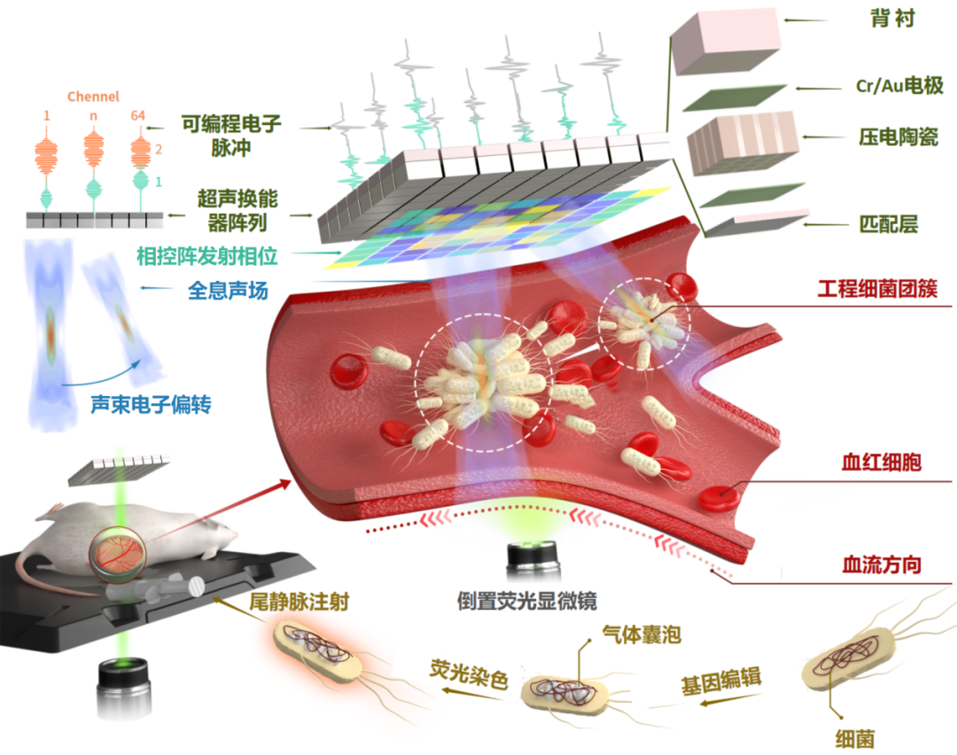 從理論研究層面,該團隊提出了復雜聲場環境中聲輻射力離散表達與計算理論,解決了復雜聲場的任意結構微粒受力量化表征的問題,并探究了復雜環境中空間聲場作用下操控目標的動力學行為。從工程研發層面,該團隊通過長期的技術探索與積累,攻克了高密度聲鑷換能器研發中聲場設計和制造工藝等難題,研制了二維高密度超聲換能器陣列,利用全息元素構建和時間復用的方法,結合多通道高精度時間反演超聲激勵,實現了強梯度聲場生成和復雜聲場的時空動態調控。從生物醫學應用層面,該團隊利用基因編輯技術,在細菌細胞中產生了亞微米氣體囊泡,提升了細菌的超聲敏感性,增強了其受到的聲輻射力,使得含氣囊細菌可以克服流體拉力,驅使它們在焦點區域聚集形成團簇(圖3)。