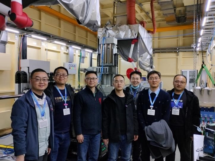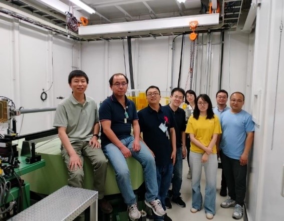 圖4. 測試團隊在上海光源稀有元素線站7元1m-XES譜儀前合影,(從左到右) 郭志英、徐偉、曾建榮、楊俊亮、張玉駿、刁千順、靳碩學;