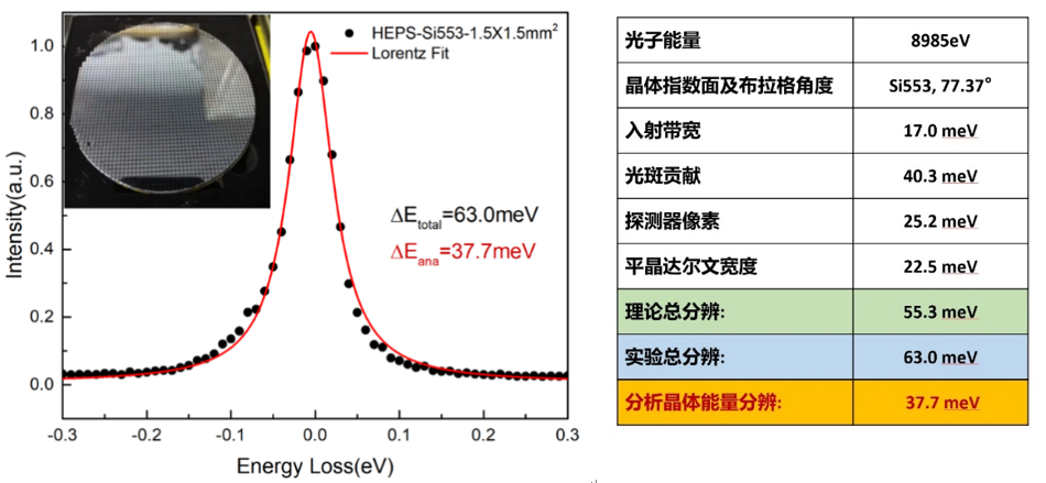 值得一提的是,2022年10月,依托北京同步輻射裝置,HEPS首批自主研制X射線拉曼散射(XRS)譜儀分析晶體完成在線表征,實測1eV(FWHM)@9.7 keV;2023年3月,依托上海光源BL13SSW稀有元素線站,HEPS相關人員與上海光源邊風剛研究員、何上明研究員、曾建榮副研究員、洪春霞高級工程師等團隊合作,完成了一批(15組)條帶型高分辨XRS分析晶體的在線表征,實測0.53 eV@9.7 keV。