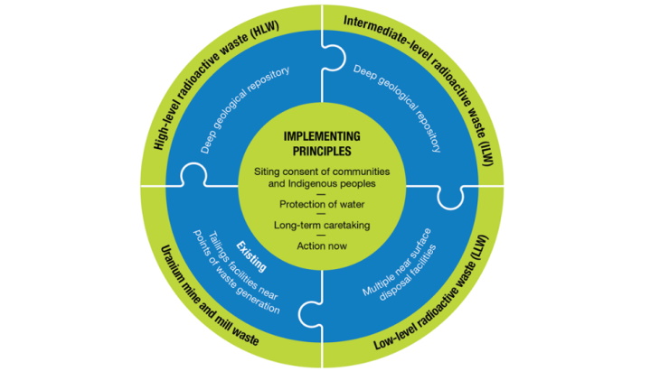 該戰略包括支持有效實施這些建議的四項原則。未來設施的規劃必須通過選址過程獲得當地社區和原住民的同意。設施設計應優先考慮水的保護。對處置設施應建立長期“看管”。該戰略指出,現在必須采取行動處理這些廢物,而不是留給子孫后代。